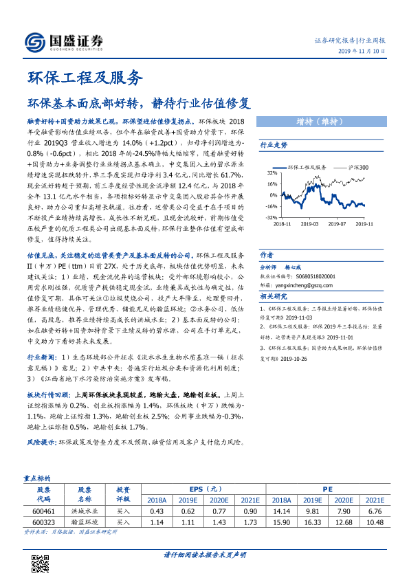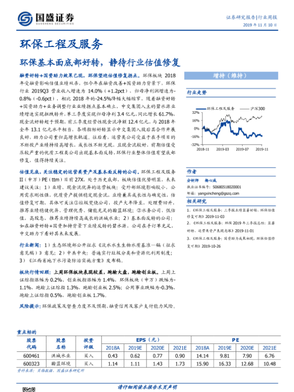【国盛证券】【20191110】环保工程及服务行业周报:环保基本面底部好转,静待行业估值修复-13页