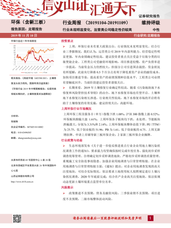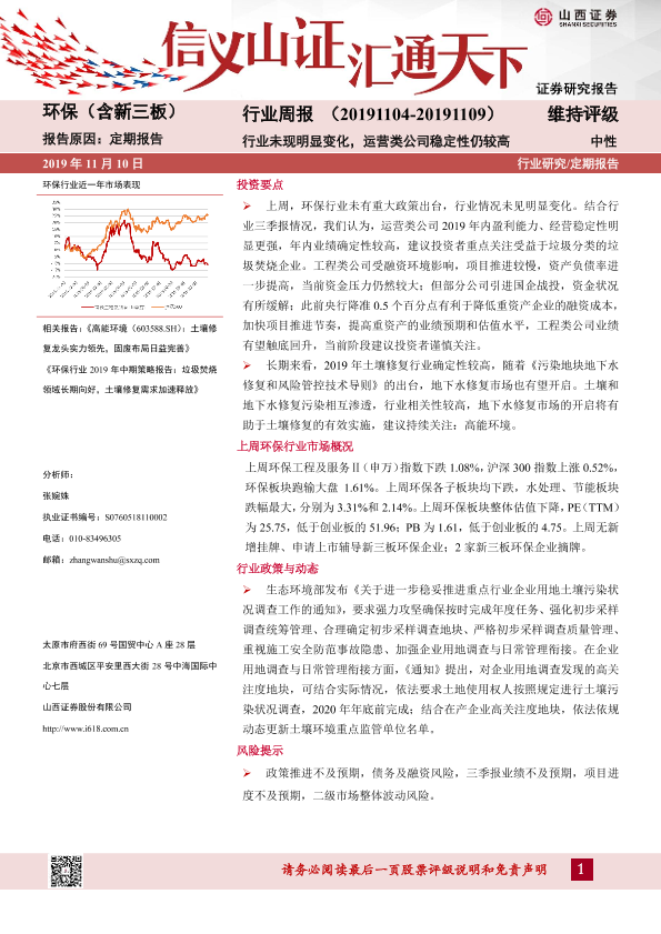 【山西证券】【20191110】环保(含新三板)行业周报:行业未现明显变化,运营类公司稳定性仍较高-10页