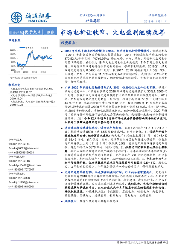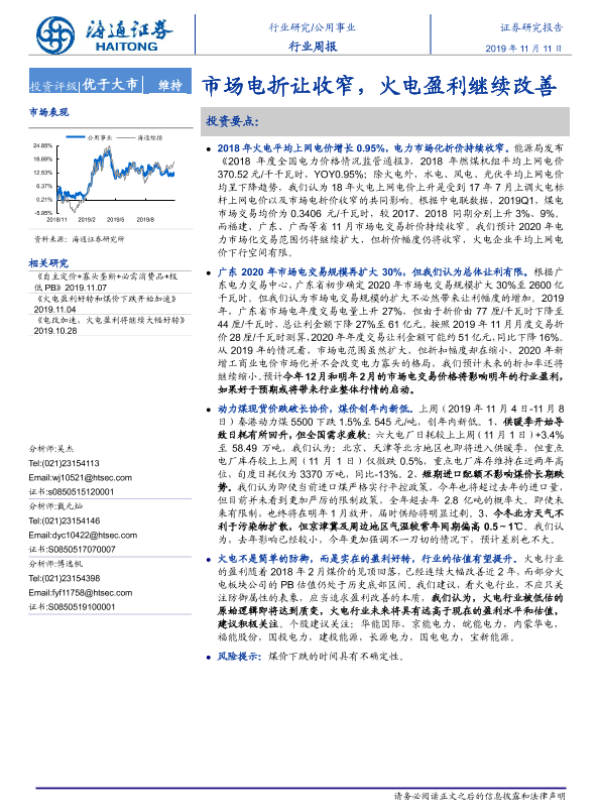 【海通证券】【20191111】公用事业行业周报:市场电折让收窄,火电盈利继续改善-2页