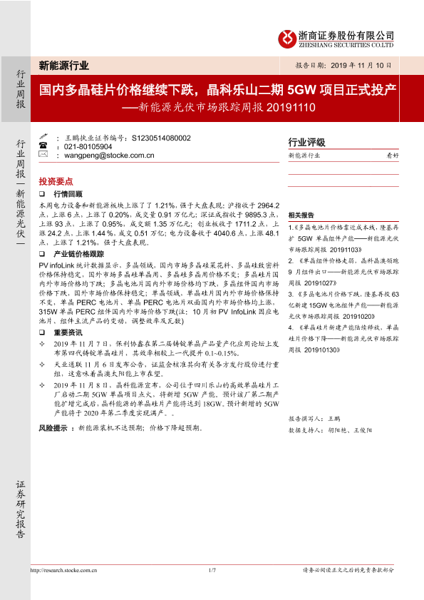 【浙商证券】【20191110】国内多晶硅片价格继续下跌,晶科乐山二期5GW项目正式投产-7页