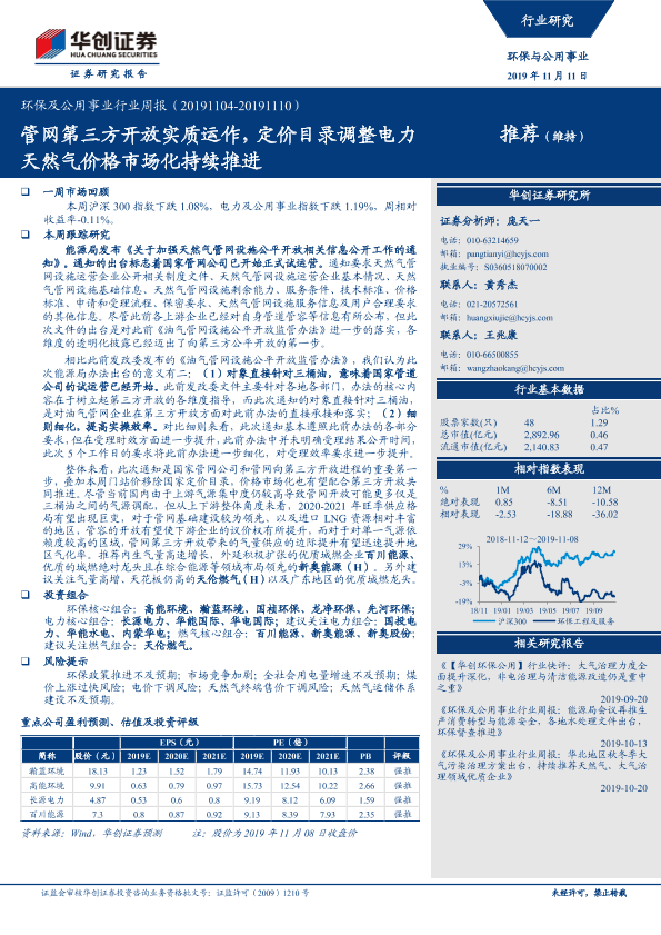 【华创证券】【20191111】环保及公用事业行业周报:管网第三方开放实质运作,定价目录调整电力天然气价格市场化持续推进-29页