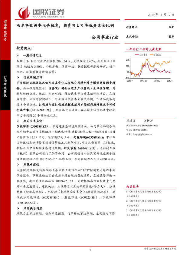 【国联证券】【20191117】公用事业行业:响水事故调查报告批复,投资项目可降低资本金比例-12页