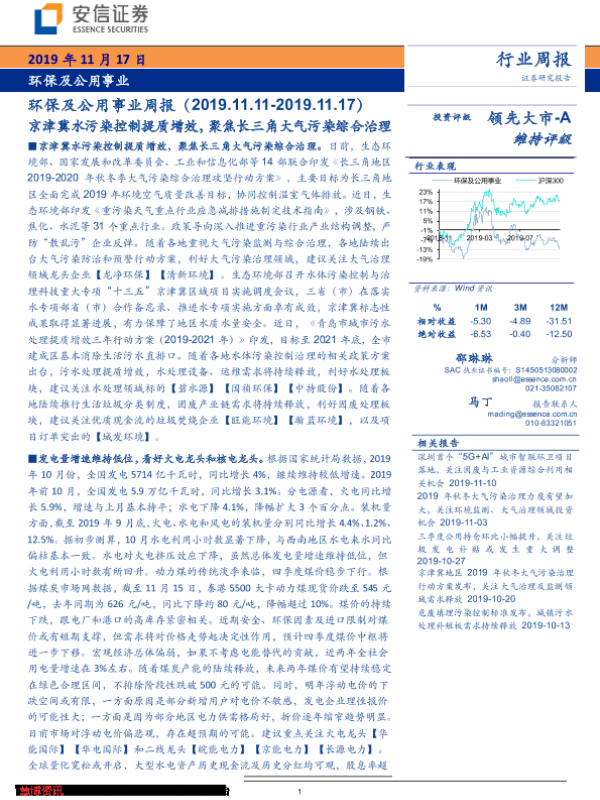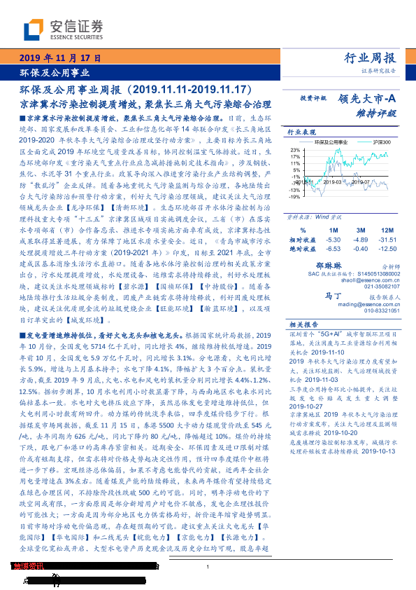 【安信证券】【20191117】环保及公用事业周报:京津冀水污染控制提质增效,聚焦长三角大气污染综合治理-21页