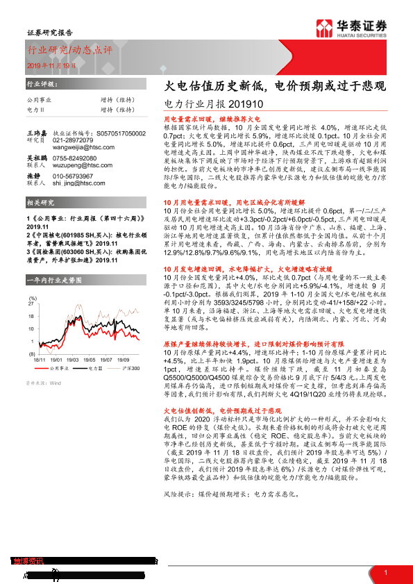 【华泰证券】【20191119】电力行业月报:火电估值历史新低,电价预期或过于悲观-13页