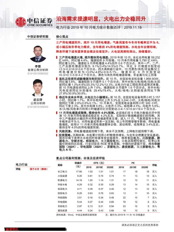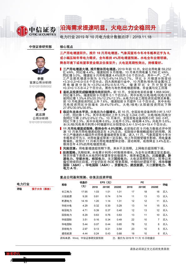 【中信证券】【20191118】2019年10月电力统计数据点评:沿海需求提速明显,火电出力企稳回升-14页