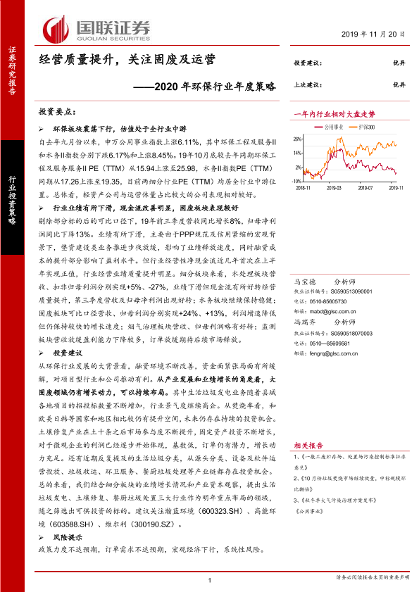 【国联证券】【20191120】2020年环保行业年度策略:经营质量提升,关注固废及运营-40页