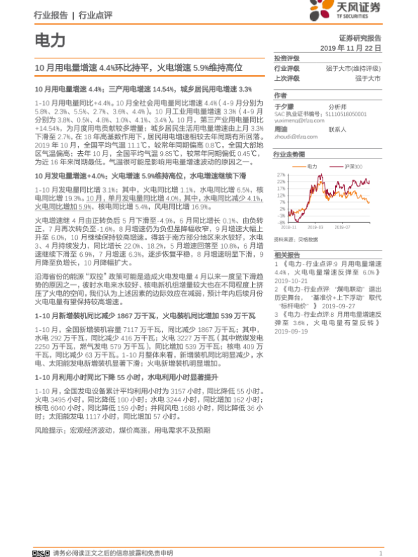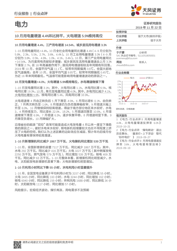 【天风证券】【20191122】10月用电量增速4.4%环比持平,火电增速5.9%维持高位-10页
