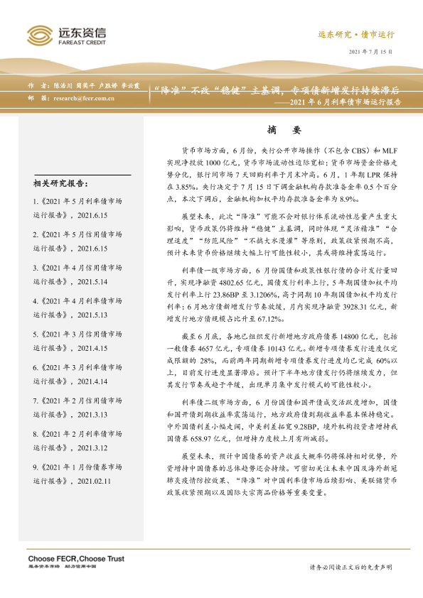 【远东资信】【20210715】2021年6月利率债市场运行报告:“降准”不改“稳健”主基调,专项债新增发行持续滞后-16页