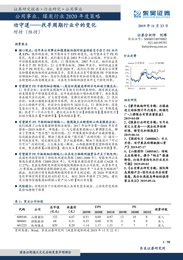 【东吴证券】【20191123】公用事业、煤炭行业2020年度策略:功守道——找寻周期行业中的变化-50页