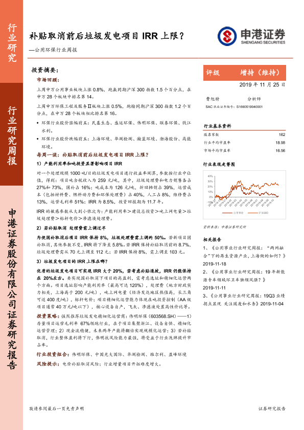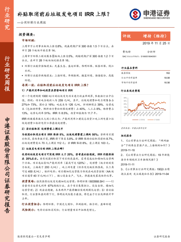【申港证券】【20191125】补贴取消前后垃圾发电项目IRR上限?-20页
