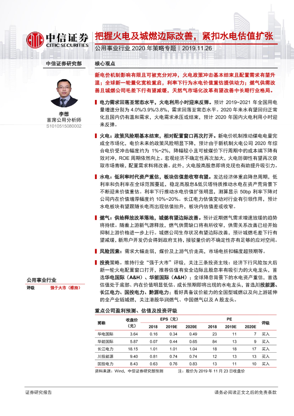 【中信证券】【20191126】公用事业行业2020年策略专题:把握火电及城燃边际改善,紧扣水电估值扩张-33页