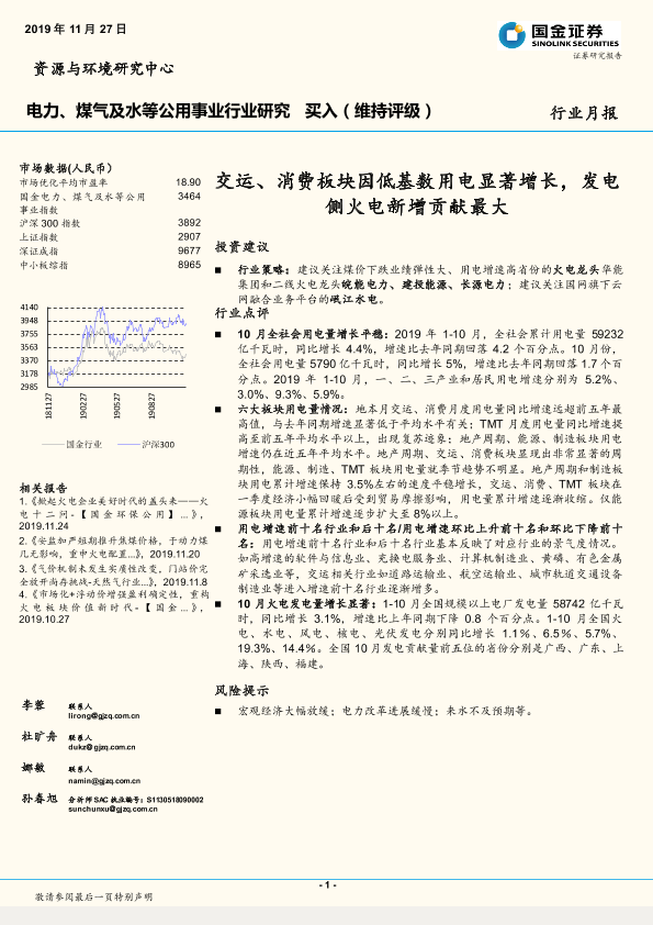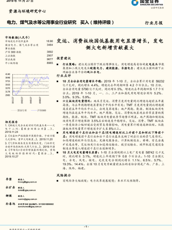 【国金证券】【20191127】电力、煤气及水等公用事业行业研究月报:交运、消费板块因低基数用电显著增长,发电侧火电新增贡献最大-13页