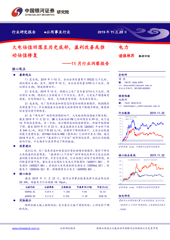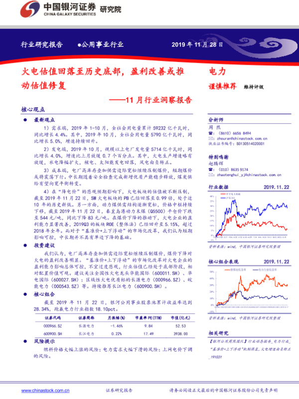 【银河证券】【20191128】11月行业洞察报告:火电估值回落至历史底部,盈利改善或推动估值修复-24页