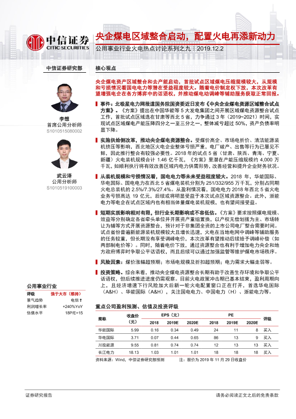 【中信证券】【20191202】公用事业行业火电热点讨论系列之九:央企煤电区域整合启动,配置火电再添新动力-6页