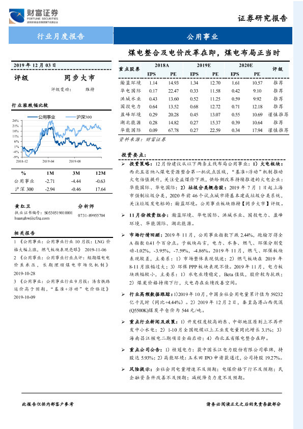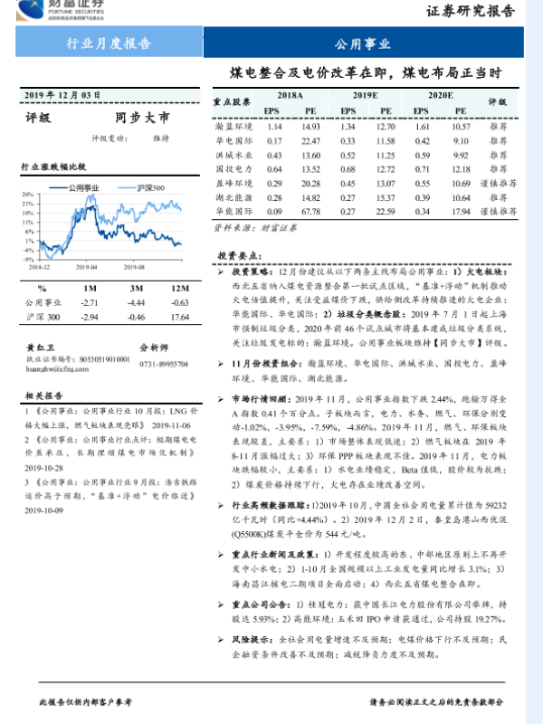 公用事业 垃圾分类 火电企业 煤电整合 电价改革