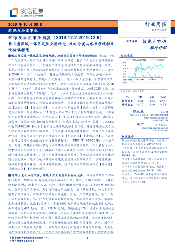 【安信证券】【20191208】环保及公用事业周报:长三角区域一体化发展全面推进,垃圾分类与水处理提标改造持续推进-17页