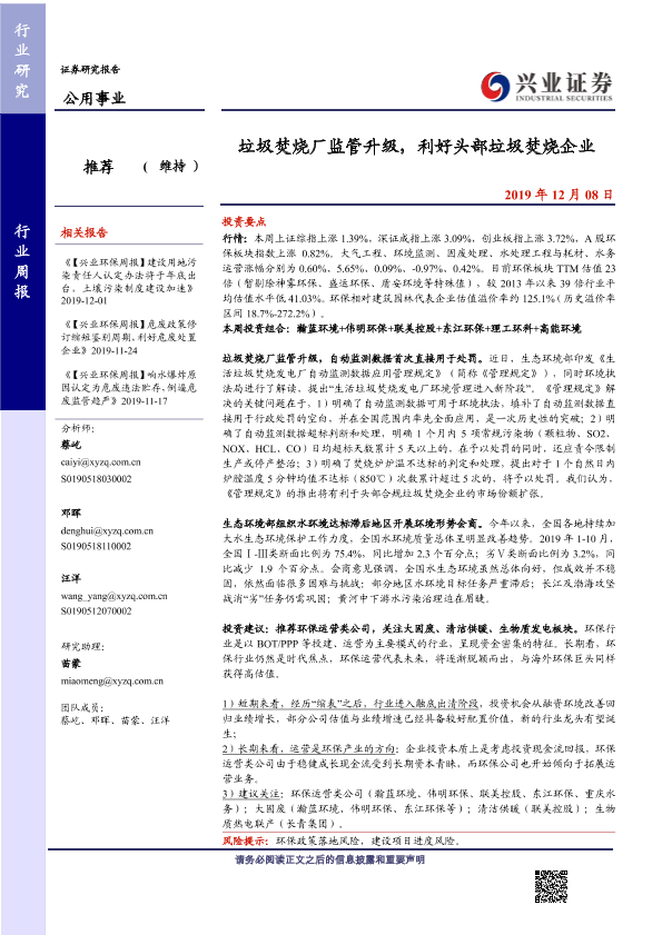 【兴业证券】【20191208】垃圾焚烧厂监管升级,利好头部垃圾焚烧企业-10页