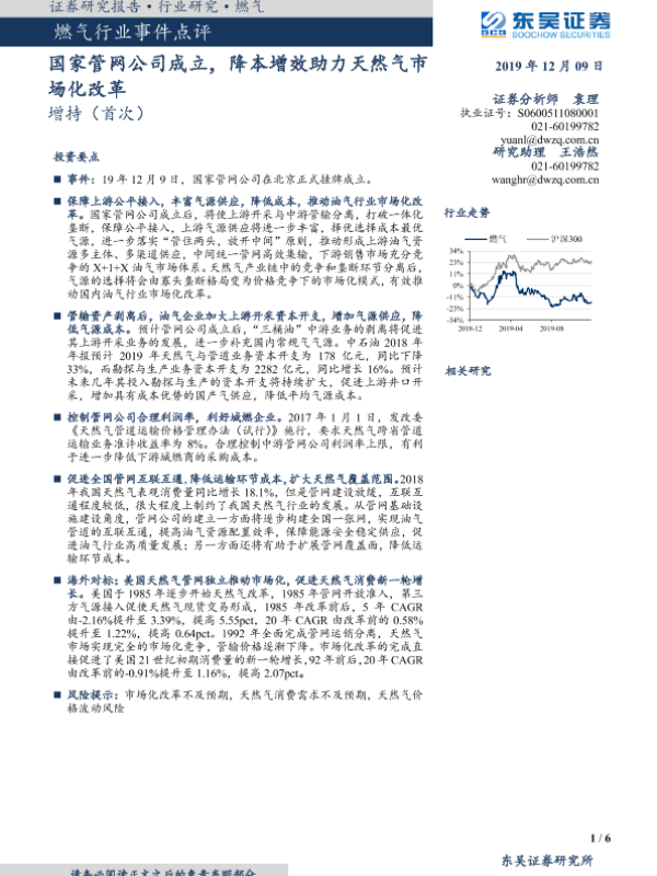 【东吴证券】【20191209】燃气行业事件点评:国家管网公司成立,降本增效助力天然气市场化改革-6页