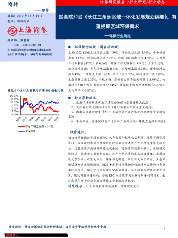 【上海证券】【20191210】环保行业周报:国务院印发《长江三角洲区域一体化发展规划纲要》,有望提振区域环保需求-7页