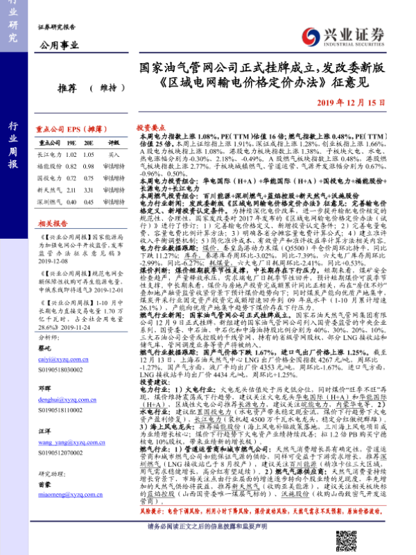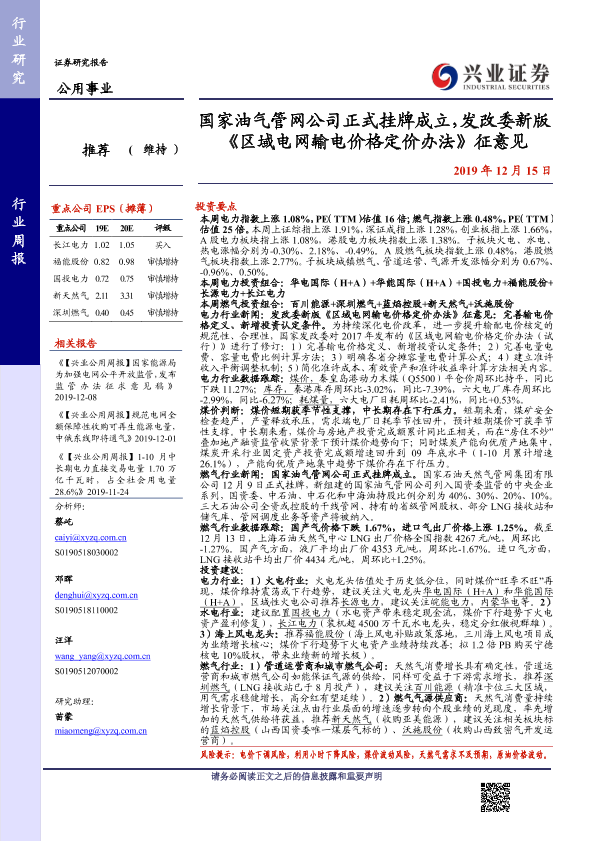 【兴业证券】【20191215】国家油气管网公司正式挂牌成立,发改委新版《区域电网输电价格定价办法》征意见-16页