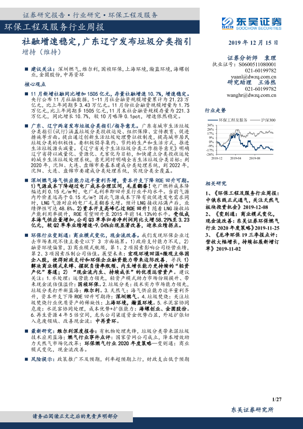 【东吴证券】【20191215】环保工程及服务行业周报:社融增速稳定,广东辽宁发布垃圾分类指引-27页