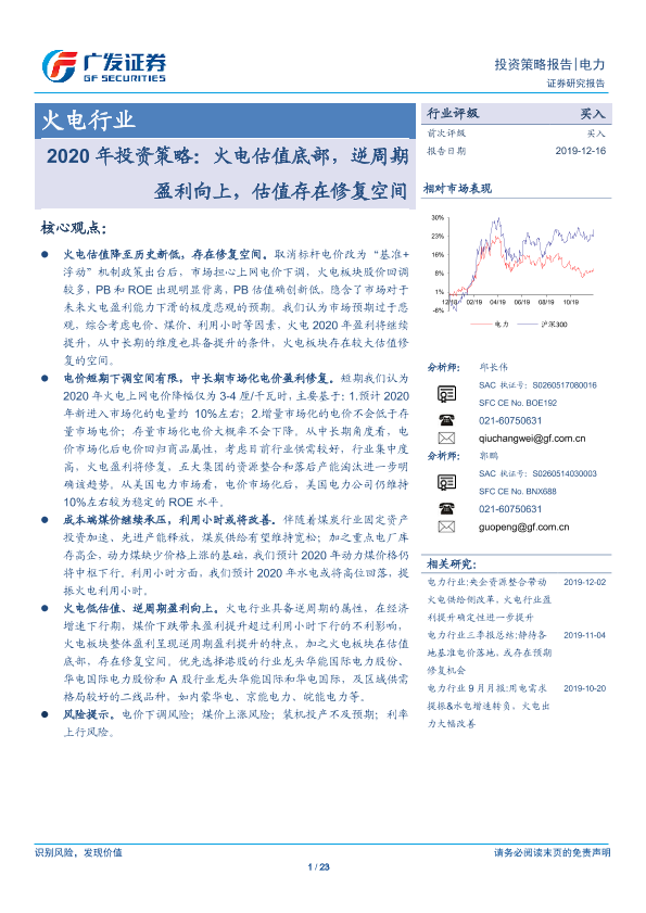 【广发证券】【20191216】2020年投资策略:火电估值底部,逆周期盈利向上,估值存在修复空间-23页