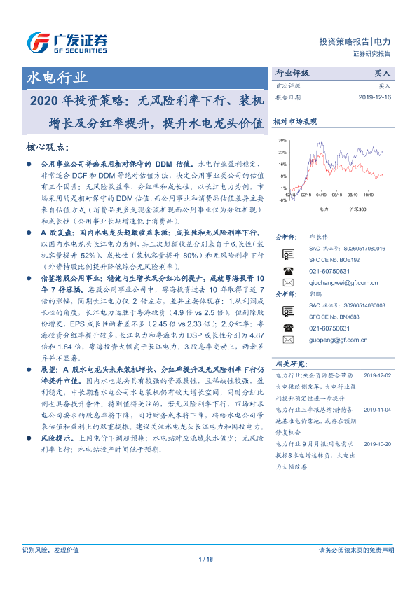 【广发证券】【20191216】2020年水电行业投资策略:无风险利率下行、装机增长及分红率提升,提升水电龙头价值-16页