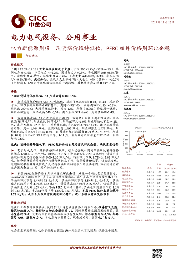 【中金公司】【20191216】电力新能源周报:现货煤价维持低位,PERC组件价格周环比企稳-9页