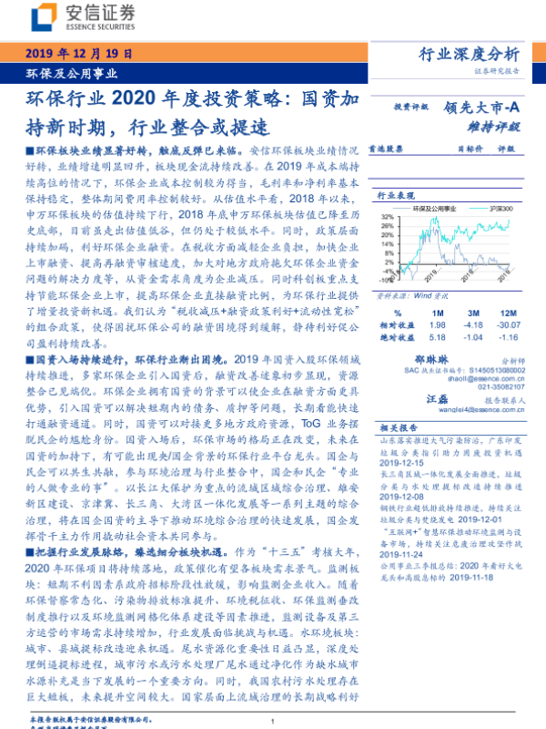 【安信证券】【20191219】环保行业2020年度投资策略:国资加持新时期,行业整合或提速-35页