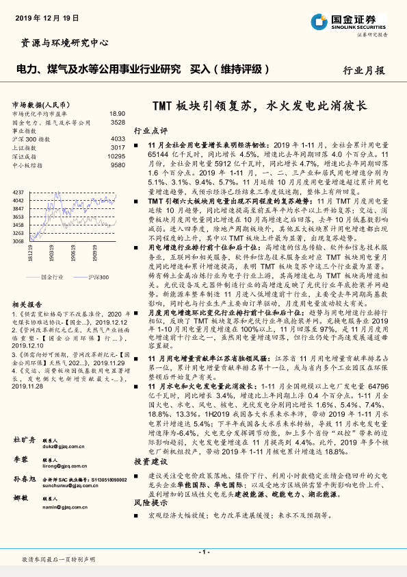【国金证券】【20191219】电力、煤气及水等公用事业行业研究:TMT板块引领复苏,水火发电此消彼长-13页