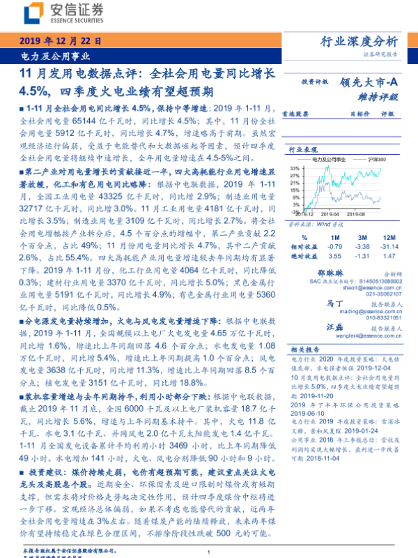 【安信证券】【20191222】11月发用电数据点评:全社会用电量同比增长4.5%,四季度火电业绩有望超预期-20页
