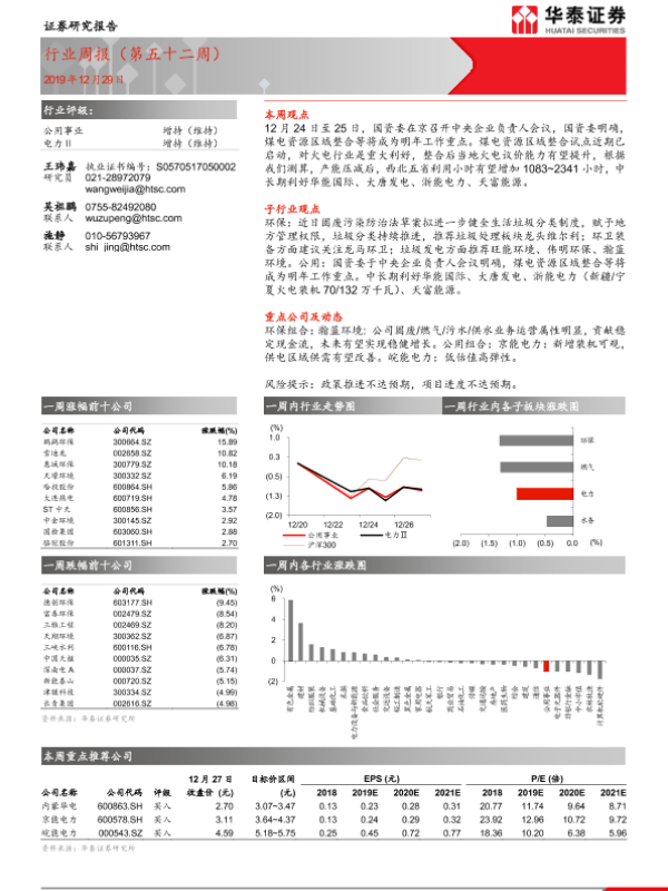 【华泰证券】【20191229】公用事业行业周报(第五十二周)-10页