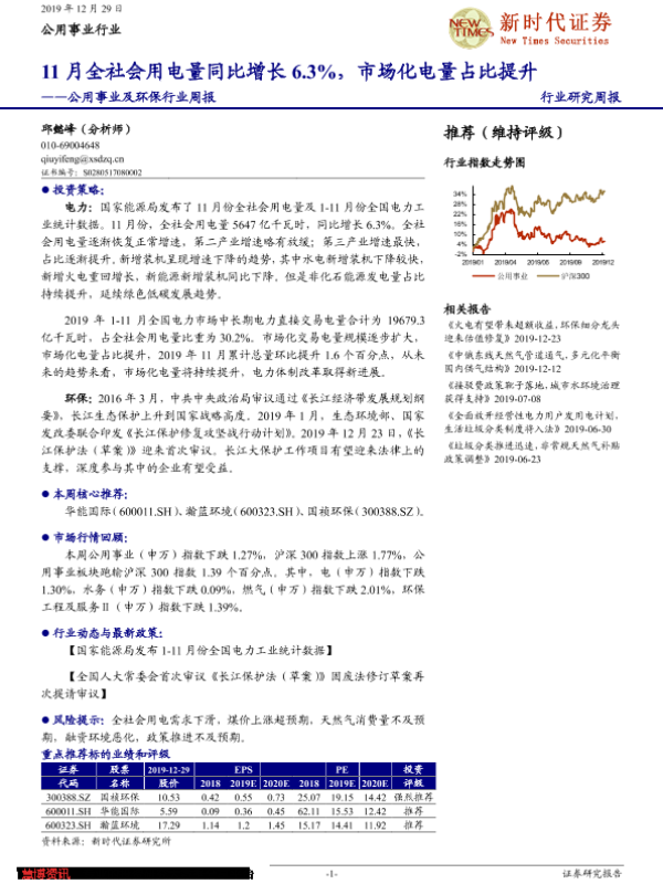 【新时代证券】【20191229】公用事业及环保行业周报:11月全社会用电量同比增长6.3%,市场化电量占比提升-11页