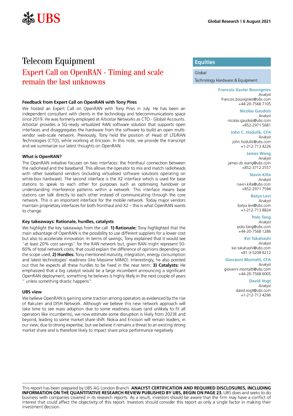 【瑞银】【20210806】全球科技硬件设备行业-专家呼吁开放式无线接入网:时间和规模仍然是最后的未知数-33页