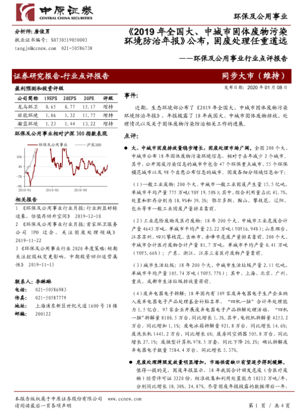 【中原证券】【20200108】2019年全国大、中城市固体废物污染环境防治年报公布,固废处理任重道远-4页