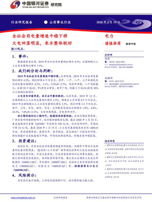 【银河证券】【20200119】全社会用电量增速平稳下移 火电回落明显,来水整体较好-3页