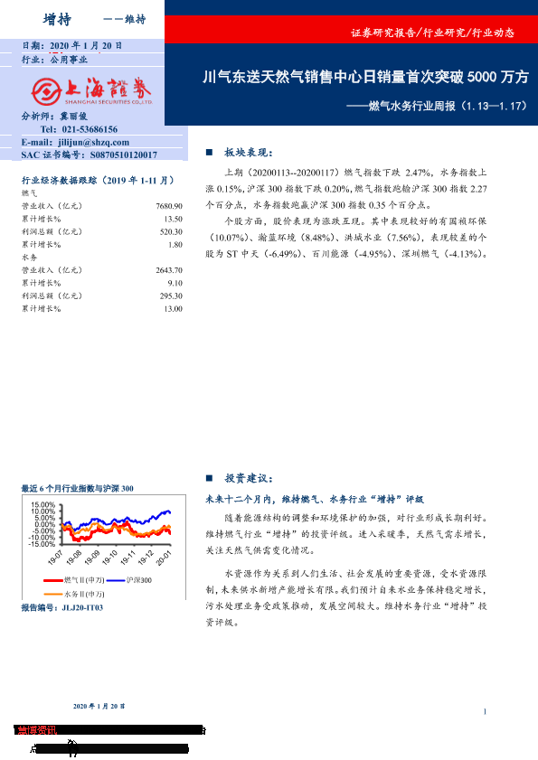 【上海证券】【20200120】燃气水务行业周报:川气东送天然气销售中心日销量首次突破5000万方-7页