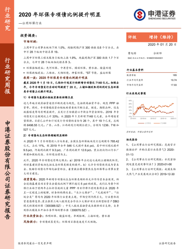 【申港证券】【20200120】2020年环保专项债比例提升明显——公用环保行业研究周报-16页