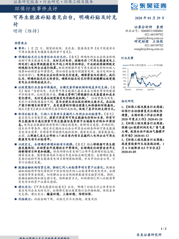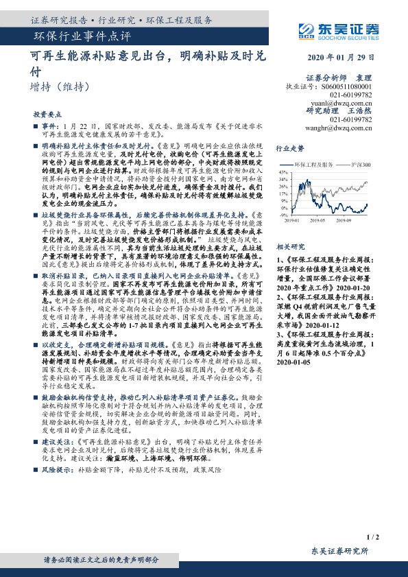 【东吴证券】【20200129】环保行业事件点评:可再生能源补贴意见出台,明确补贴及时兑付-2页