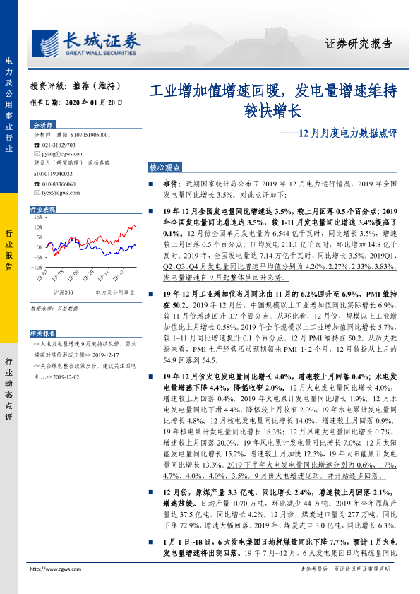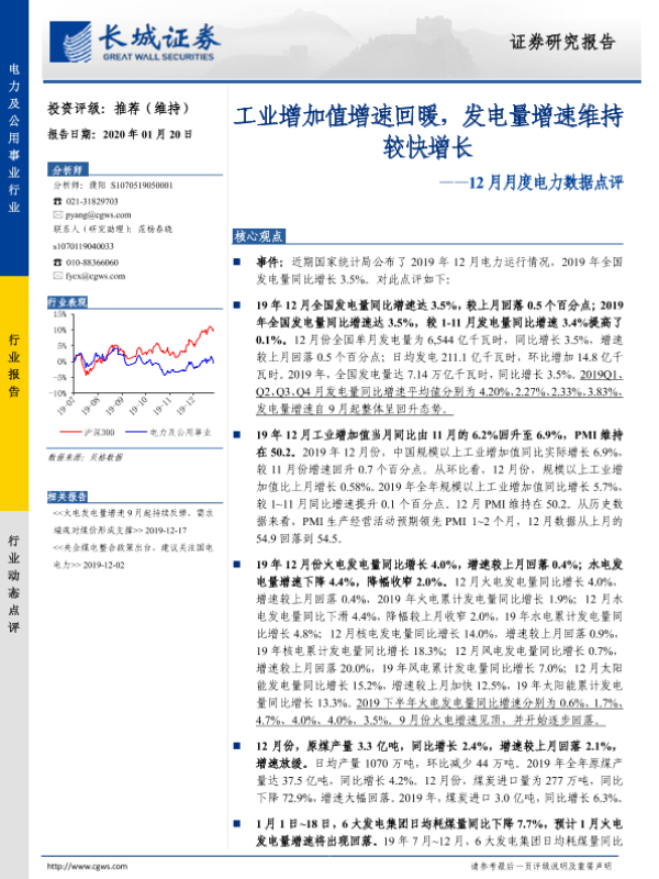 【长城证券】【20200120】12月月度电力数据点评:工业增加值增速回暖,发电量增速维持较快增长-6页