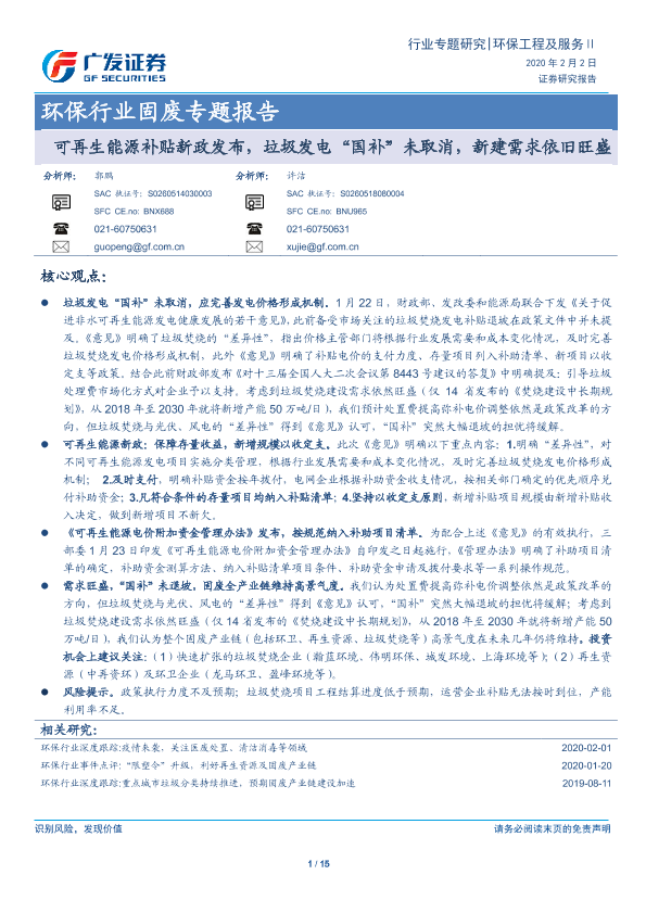 【广发证券】【20200202】环保行业固废专题报告:可再生能源补贴新政发布,垃圾发电“国补”未取消,新建需求依旧旺盛-15页