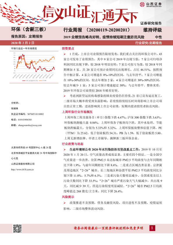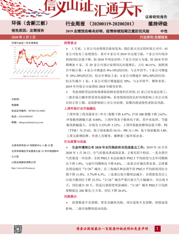 【山西证券】【20200202】环保(含新三板)行业周报:2019业绩预告略有好转,疫情持续短期注意防范风险-11页