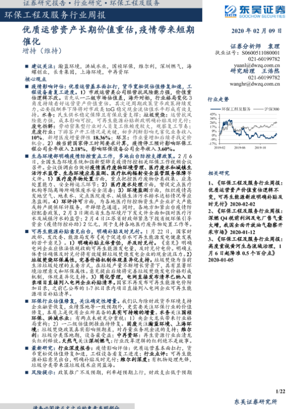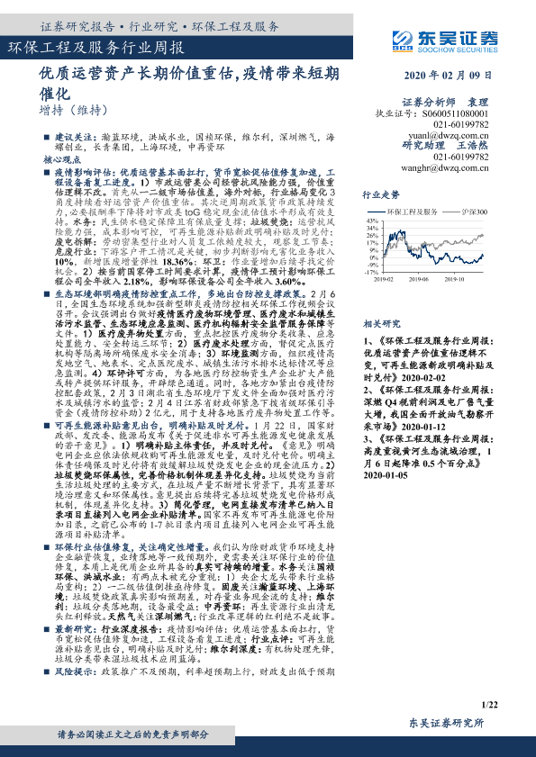 【东吴证券】【20200209】环保工程及服务行业周报:优质运营资产长期价值重估,疫情带来短期催化-22页