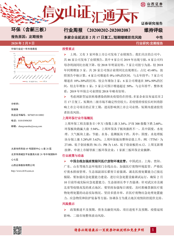 【山西证券】【20200209】环保(含新三板)行业周报:多家企业延迟至2月17日复工,短期继续防范风险-10页
