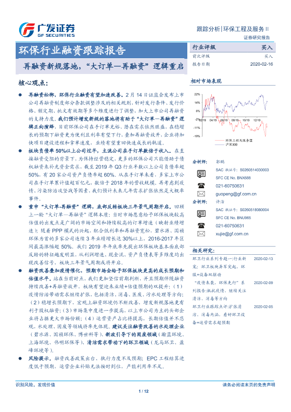 【广发证券】【20200216】环保行业融资跟踪报告:再融资新规落地,“大订单—再融资”逻辑重启-12页