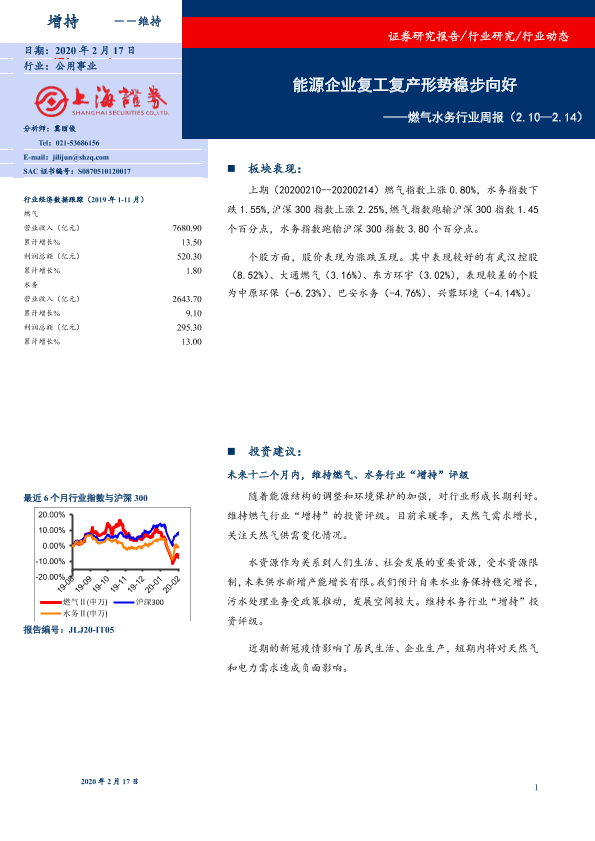 【上海证券】【20200217】燃气水务行业周报:能源企业复工复产形势稳步向好-8页