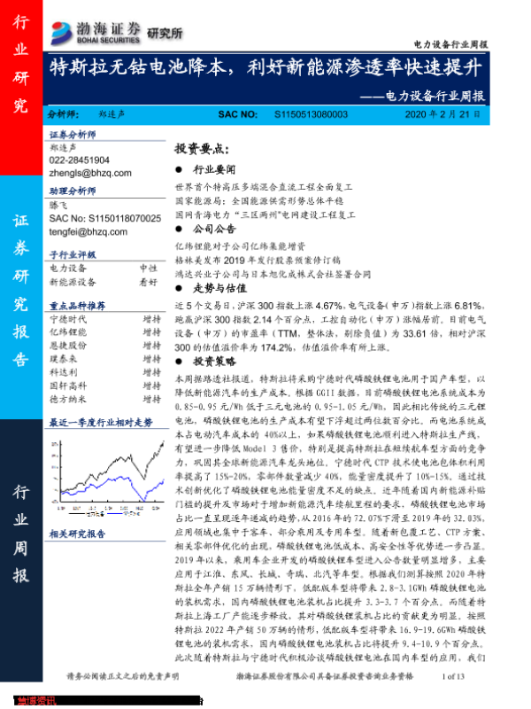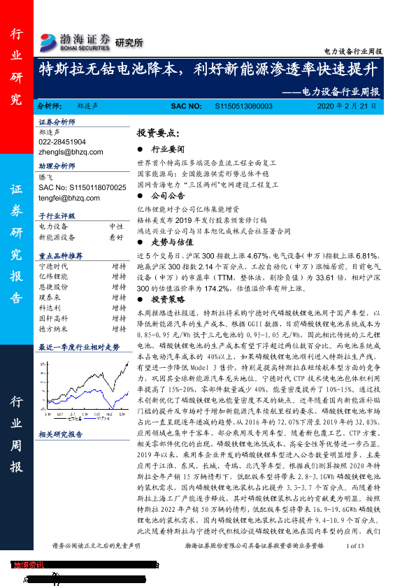 【渤海证券】【20200221】电力设备行业周报:特斯拉无钴电池降本,利好新能源渗透率快速提升-13页
