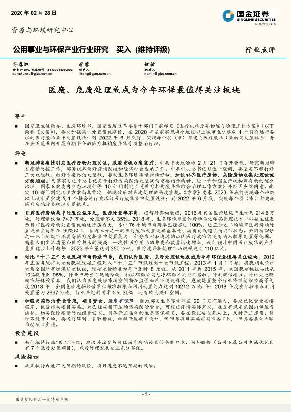 【国金证券】【20200228】公用事业与环保产业行业研究:医废、危废处理或成为今年环保最值得关注板块-3页