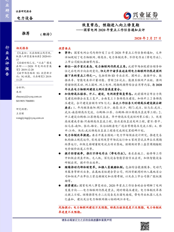 【兴业证券】【20200227】国家电网2020年重点工作任务通知点评:恢复常态,预期进入向上修复期-8页