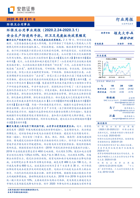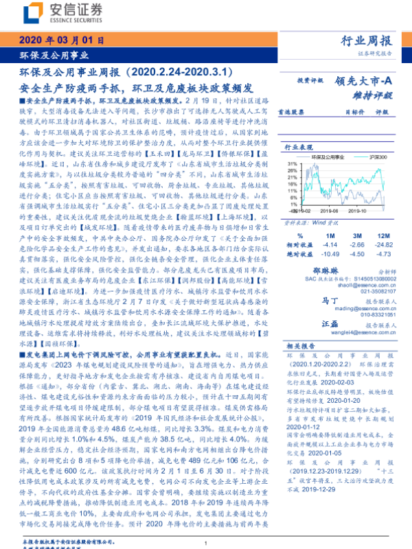 【安信证券】【20200301】环保及公用事业周报:安全生产防疫两手抓,环卫及危废板块政策频发-19页